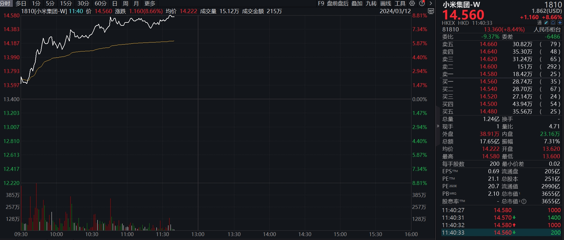 受此影响,3月12日开盘,小米集团港股短线拉升,截至发稿,股价报14.560港元,涨超8%。