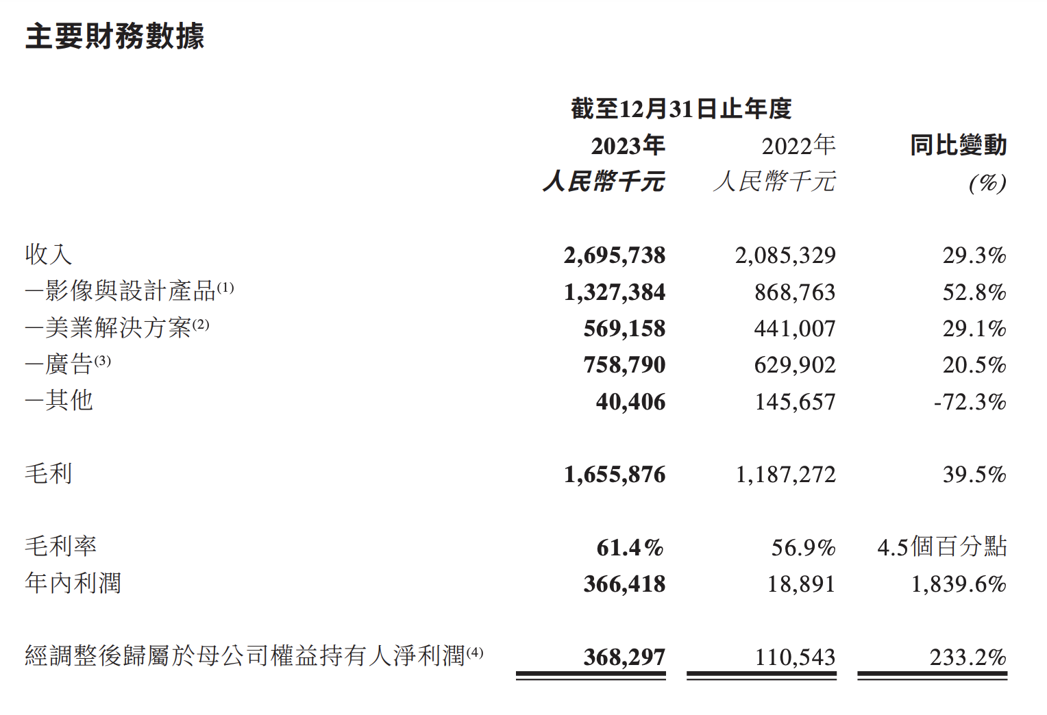截至2023年12月31日,美图付费订阅用户人数为911万,同比大幅增长62.3%,创历史新高。美图总体月活跃用户数达2.5亿,同比增长2.6%。其中,来自生产力应用的用户增长显著,同比增长74.3%达到约1770万。