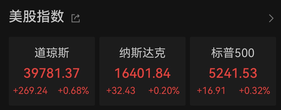 当地时间周四,美股三大指数集体收涨,续刷历史新高。截至收盘,道指涨0.68%,报39781.37点;纳指涨0.20%,报16401.84点;标普500指数涨0.32%,报5241.53点。
