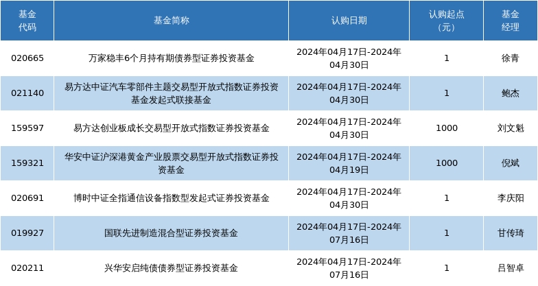 数据显示,2024年04月17日共有7只新基金发行。其中股票型基金4只,包括易方达中证汽车(930607.ZZ)零部件主题交易型开放式指数证券投资基金发起式联接基金、易方达创业板成长交易型开放式指数证券投资基金、华安中证沪深港黄金产业股票交易型开放式指数证券投资基金等,混合型基金1只,债券型基金2只,其他类型0只。