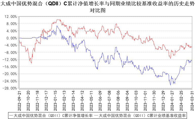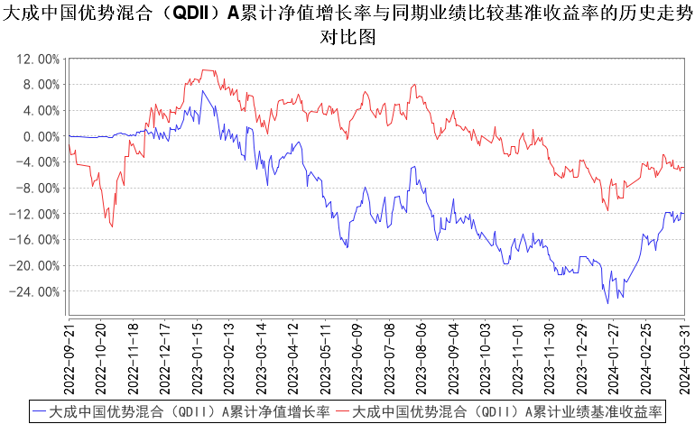 报告显示,大成中国优势混合(QDII)2024年一季度净值收益率,业绩比较基准个百分点,以下为其成立以来净值收益率与同期业绩比较基准(恒生指数收益率(使用估值汇率折算)×50%+中证海外内地股指数收益率×15%+沪深300指数收益率×5%+中债总指数(全价)收益率×20%+银行人民币活期存款利率(税后)×10%)的走势对比: