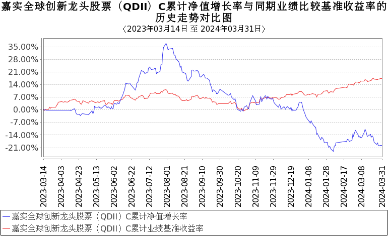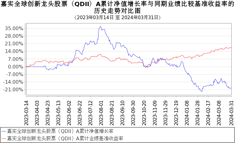 报告显示,嘉实全球创新龙头股票(QDII)2024年一季度净值收益率,业绩比较基准个百分点,以下为其成立以来净值收益率与同期业绩比较基准(MSCI全球指数(MSCIAllCountryWorldIndex)收益率×75%+沪深300指数收益率×20%+境内银行活期存款利率(税后)×5%)的走势对比: