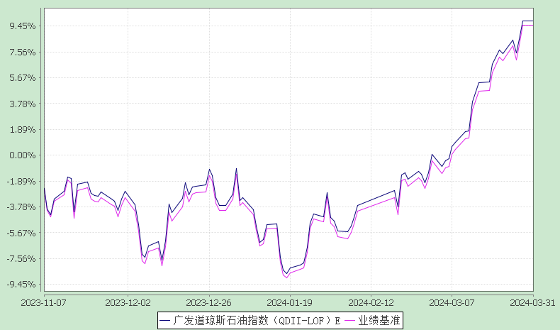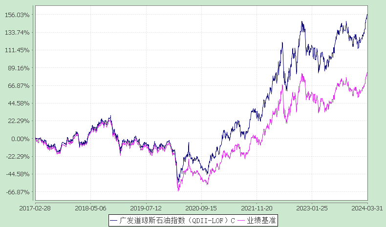 报告显示,广发道琼斯石油指数(QDII-LOF)2024年一季度净值收益率,业绩比较基准个百分点,以下为其成立以来净值收益率与同期业绩比较基准(95%×人民币计价的道琼斯美国石油开发与生产指数收益率+5%×人民币活期存款收益率(税后))的走势对比: