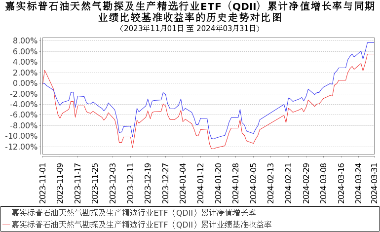 报告显示,嘉实标普石油天然气勘探及生产精选行业ETF(QDII)2024年一季度净值收益率,业绩比较基准个百分点,以下为其成立以来净值收益率与同期业绩比较基准(经估值汇率调整后的标普石油天然气勘探及生产精选行业指数收益率)的走势对比: