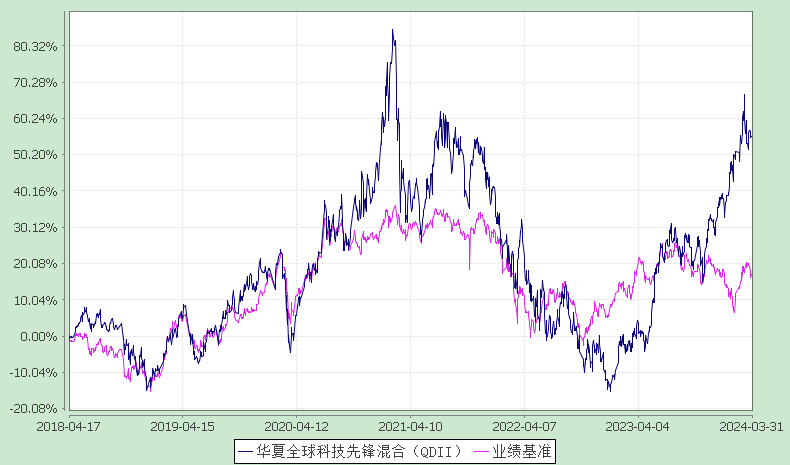 报告显示,华夏全球科技先锋混合(QDII)2024年一季度净值收益率,业绩比较基准个百分点,以下为其成立以来净值收益率与同期业绩比较基准(中证TMT产业主题指数(000998.SH)收益率*30%+中证香港美国上市中美科技指数收益率*40%+上证国债指数收益率*30%。)的走势对比: