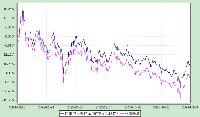 报告显示,业绩比较基准个百分点,以下为其成立以来净值收益率与同期业绩比较基准(中证有色金属指数(930708.ZZ)收益率*95%+银行活期存款利率(税后)*5%)的走势对比: