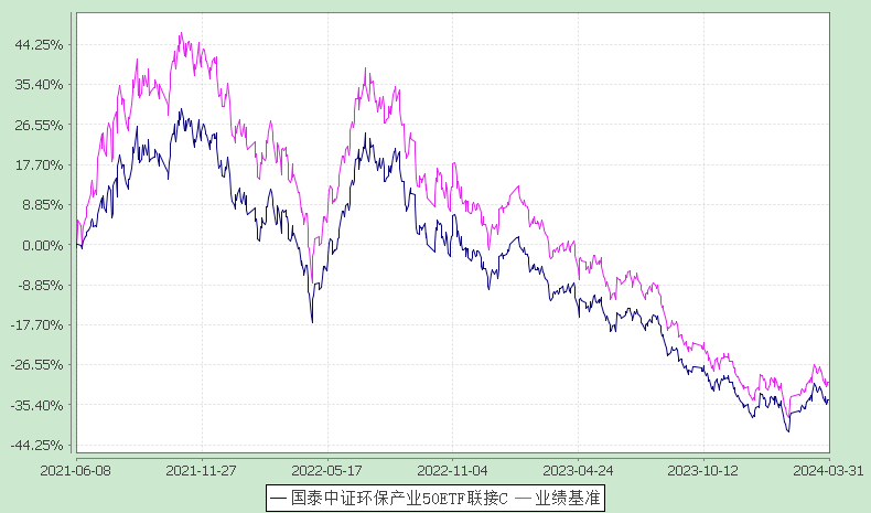 报告显示,业绩比较基准个百分点,以下为其成立以来净值收益率与同期业绩比较基准(中证环保产业50指数(930614.ZZ)收益率*95%+银行活期存款利率(税后)*5%)的走势对比: