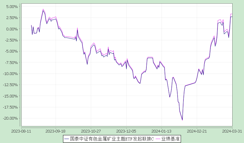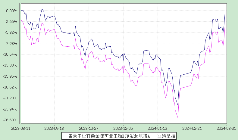 报告显示,业绩比较基准个百分点,以下为其成立以来净值收益率与同期业绩比较基准(中证有色金属矿业主题指数(931892.ZZ)收益率×95%+银行活期存款利率(税后)×5%。)的走势对比: