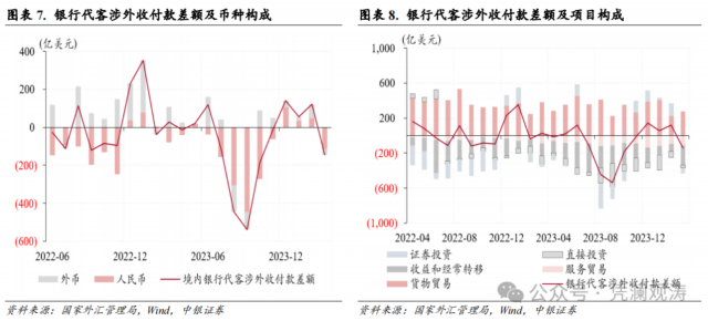 3月份,银行代客涉外收付款由此前连续3个月顺差转为逆差145亿美元。分币种看,人民币和外币收付款同时转为逆差,逆差规模分别为112亿和32亿美元,分别贡献了涉外收付款总差额降幅的60%、40%(见图表7)。