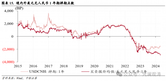 此外,掉期交易占比上升还受到境内外掉期价差走扩引发的套利行为影响。2023年5月份以来,境内外掉期价差明显扩大,2024年3月末价差超1000个基点(见图表15)。这引发了市场主体在境内办理“近结远购”、境外办理“近购远结”的套利行为。虽然在近端损失了境内外汇差,但在远端赚取了更大的境内外掉期价差。同样以3月29日为例,在岸和离岸人民币即期汇率分别为7.2232、7.2575,因此机构在近端办理“在岸结汇、离岸购汇”的汇兑损失为-342BP,但由于1年期境内掉期点数大幅低于境外,在岸和离岸远期汇率分别为6.9570、7.0962,表明机构在远端办理“在岸购汇、离岸结汇”带来的汇兑收益为+1391BP,减去近端的汇兑损失后仍有1049 BP的净收益(见图表16)。