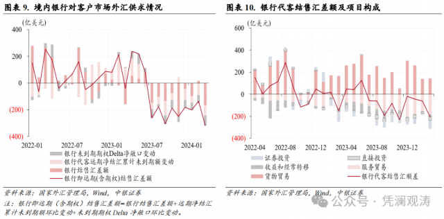 银行代客结售汇中,证券投资仍是第一大贡献项,该项结售汇逆差由上月1亿增至76亿美元,贡献了银行代客结售汇逆差增幅的52%;服务贸易结售汇逆差环比增加29亿至183亿美元,贡献率为20%,逆差创2019年以来同期新高,反映居民跨境出行等需求进一步修复;货物贸易结售汇顺差环比微增3亿至144亿美元,贡献率为-2%(见图表10)。