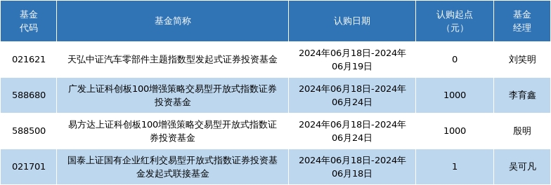 数据显示,2024年06月18日共有4只新基金发行。其中股票型基金4只,包括天弘中证汽车(930607.ZZ)零部件主题指数型发起式证券投资基金、广发上证科创板100增强策略交易型开放式指数证券投资基金、易方达上证科创板100增强策略交易型开放式指数证券投资基金等,混合型基金0只,债券型基金0只,其他类型0只。