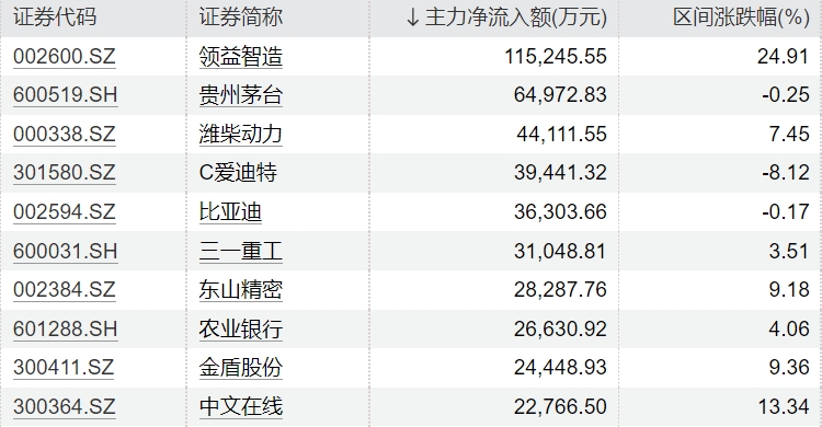 个股方面,本周领益智造获净流入11.52亿元居首,周涨24.91%,贵州茅台、潍柴动力、C爱迪特获主力净流入分别为6.50亿元、4.41亿元、3.94亿元;净流出方面,赛力斯、东方财富、天孚通信分别遭抛售24.89亿元、15.15亿元、8.80亿元。