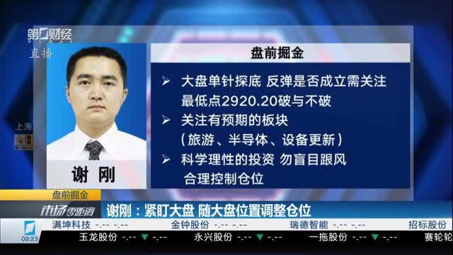 1)“一股定乾坤”仓位图:旅游综合50.62%;医药制造49.37%;现金 0.01%。2)板一:掘金功臣。掘金人:谢刚。 锦囊:一股定乾坤。近一月以来总收益:14.59%。3)板二:盘前掘金。● 大盘单针探底 反弹是否成立需关注最低点2920.20破与不破。● 关注有预期的板块(旅游、半导体、设备更新)。● 科学理性的投资 勿盲目跟风 合理控制仓位。