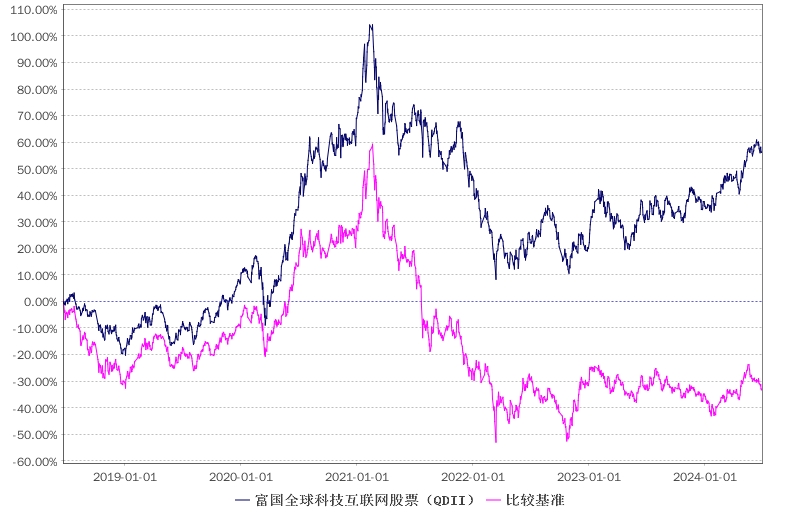 报告显示,富国全球科技互联网股票(QDII)2024年二季度净值收益率,业绩比较基准个百分点,以下为其成立以来净值收益率与同期业绩比较基准(中证海外中国互联网指数收益率×80%+中证互联网指数(H30535.ZZ)收益率×10%+中债综合全价指数收益率×10%。)的走势对比: