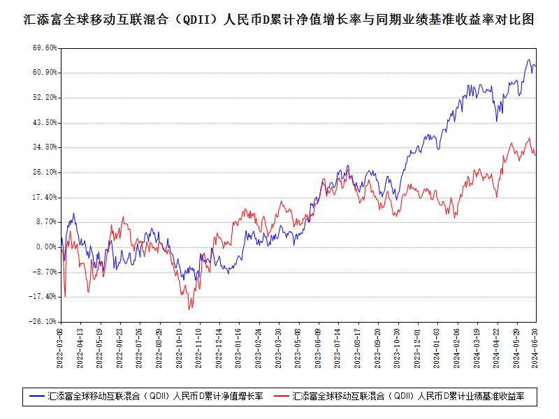 报告显示,汇添富全球移动互联混合(QDII)2024年二季度净值收益率,业绩比较基准个百分点,以下为其成立以来净值收益率与同期业绩比较基准(40%×MSCI美国信息技术指数(使用估值汇率折算)收益率+40%×人民币计价的中证海外中国互联网指数收益率+20%×中证移动互联网指数(399970.SZ)收益率)的走势对比: