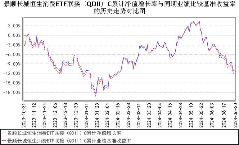 报告显示,景顺长城恒生消费ETF联接(QDII)2024年二季度净值收益率,业绩比较基准个百分点,以下为其成立以来净值收益率与同期业绩比较基准(恒生消费指数收益率(使用估值汇率折算)*95%+人民币活期存款税后利率×5%)的走势对比: