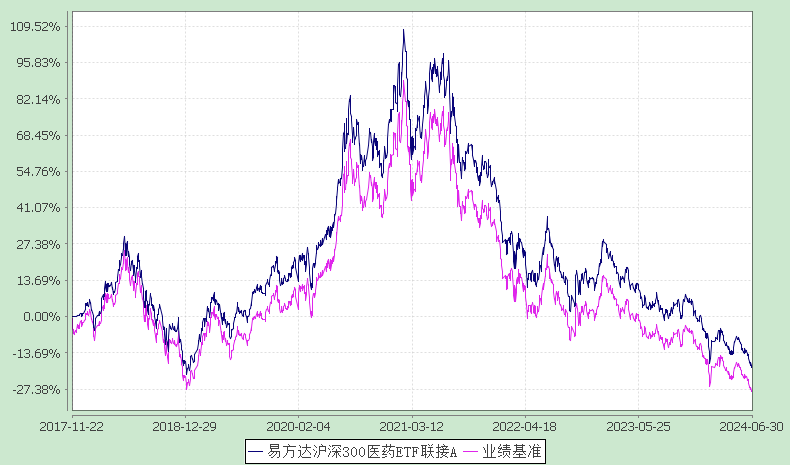 报告显示,业绩比较基准个百分点,以下为其成立以来净值收益率与同期业绩比较基准(沪深300医药卫生指数收益率×95%+活期存款利率(税后)×5%)的走势对比: