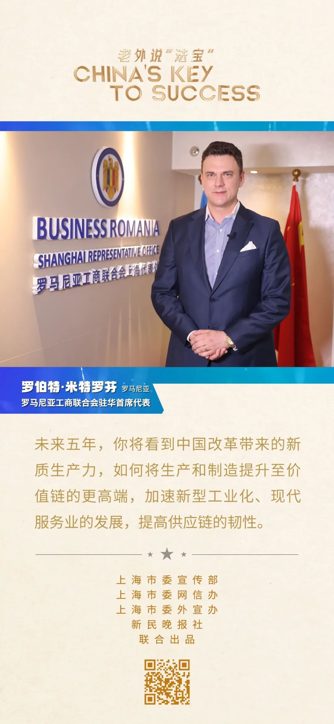 罗伯特·米特罗芬是罗马尼亚工商联合会驻华首席代表。2010年,他以罗马尼亚国家馆工作人员的身份来沪参加上海世博会,那次的旅程让他深深爱上了这座城市。从那时起,他就在上海定居。