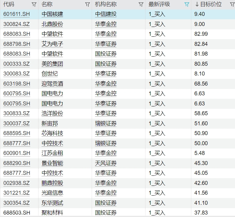 8月20日,截至发稿,机构共给出146次最新买入评级,其中43只个股目标价获公布: