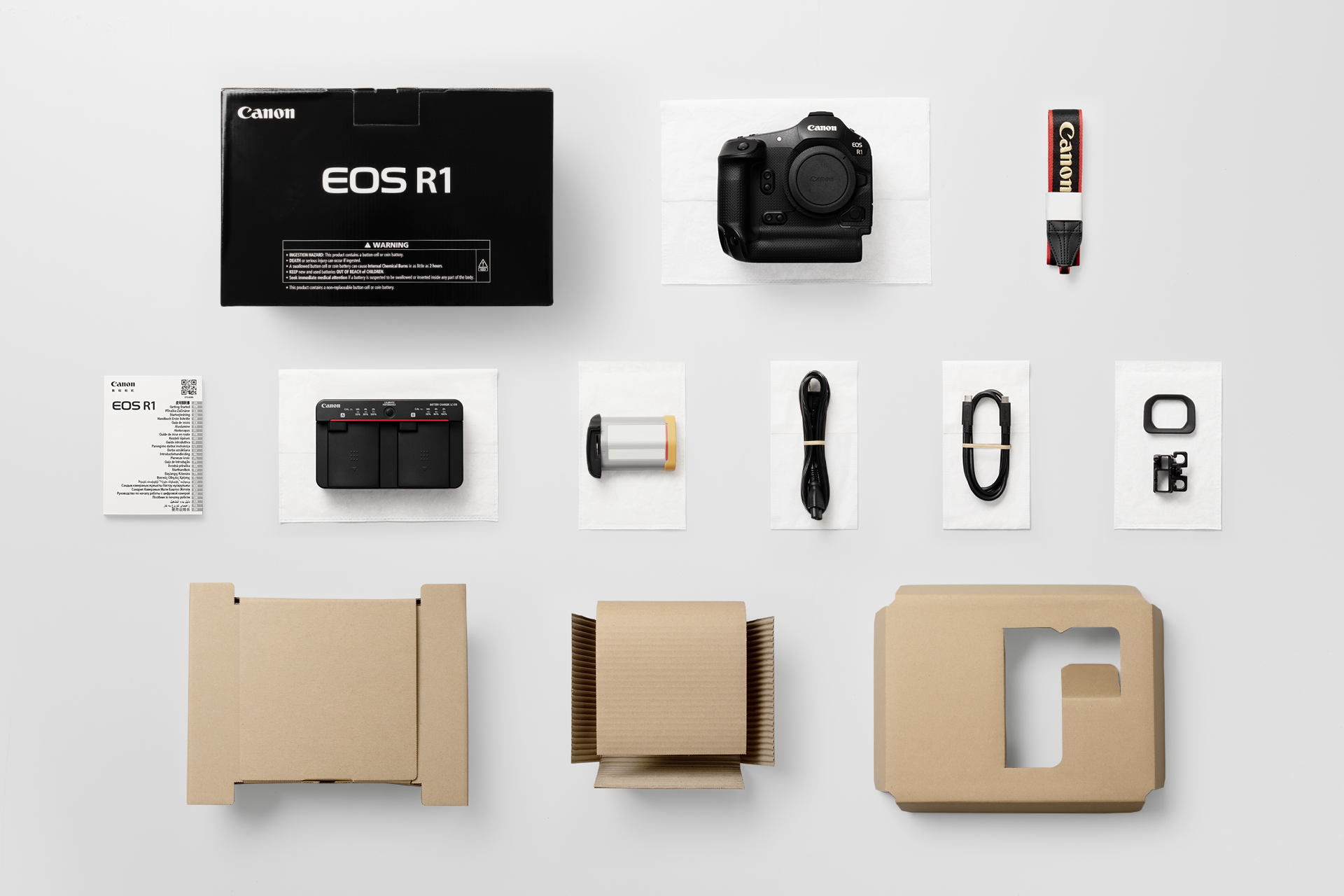 在佳能公司中,“绿色平台”已经开始在印刷部门以外的业务中取得进展。例如,佳能公司即将推出的相机产品“EOS R1”通过植物无纺布和纸质材料代替过去常用的塑料托盘和塑料袋,在维持缓冲作用保护产品的同时,尽可能减少了产品的塑料包装。