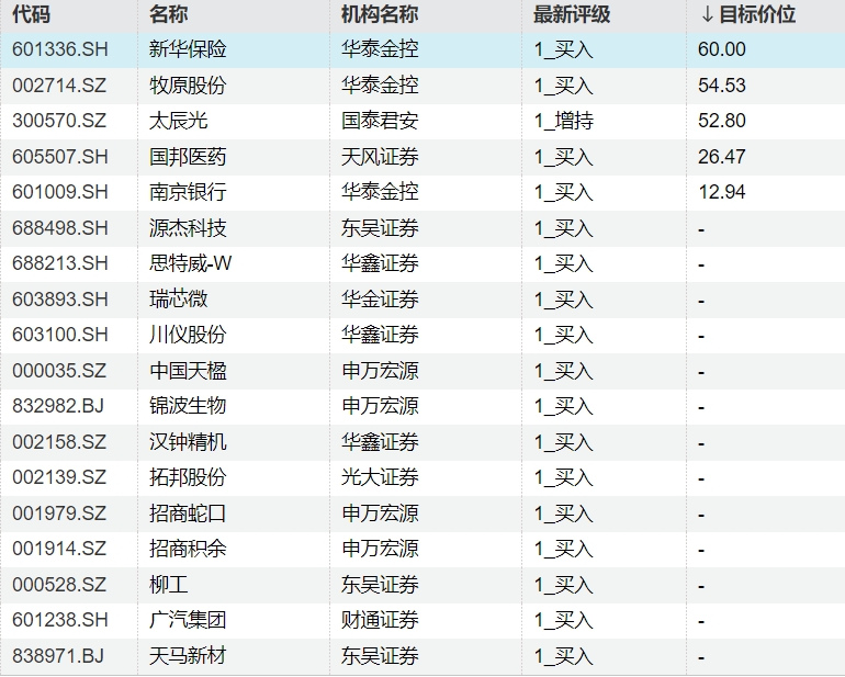 10月14日,截至发稿,机构共给出18次最新买入评级,其中5只个股目标价获公布: