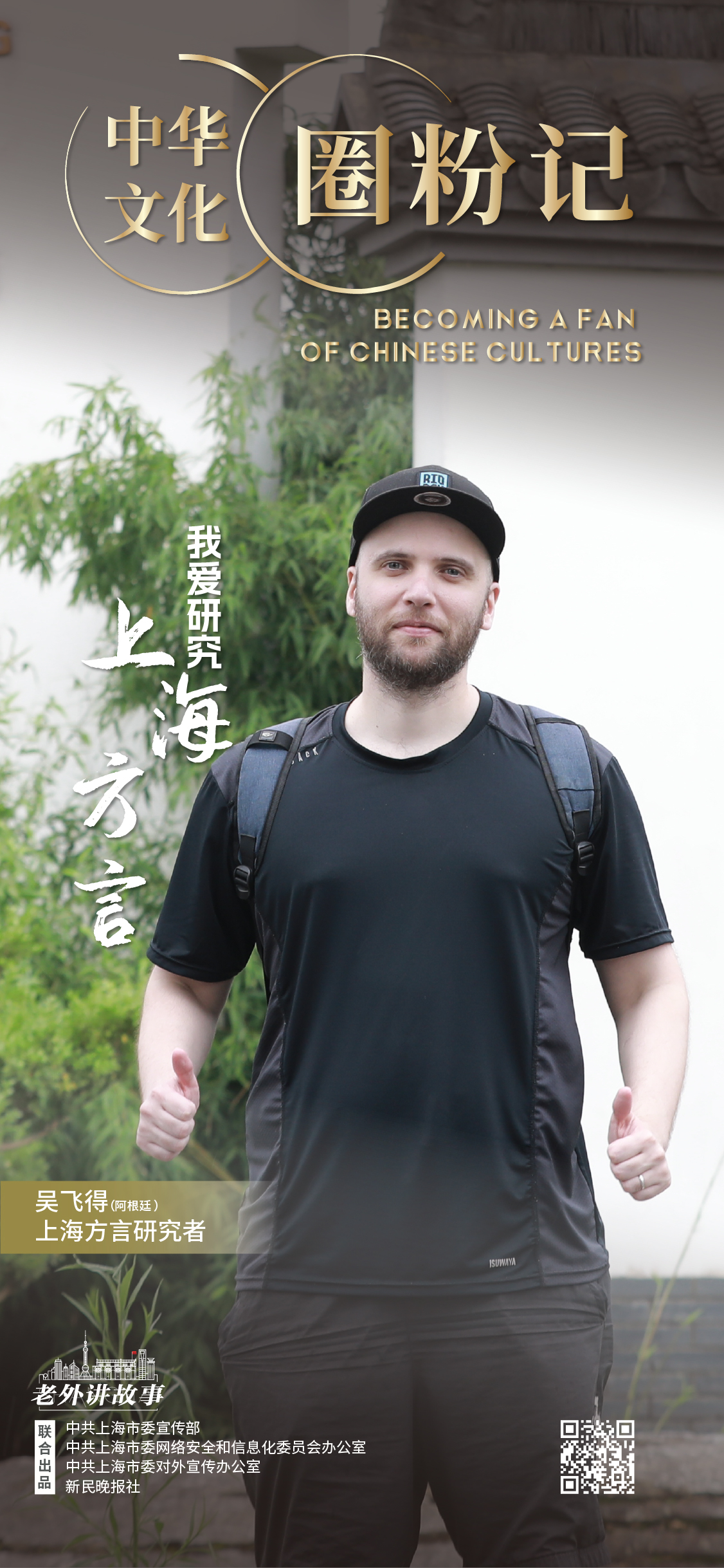 目前,已经拿到上海大学语言学硕士学位的吴飞得正忙着奔波于市区与郊区之间,深入田间地头,对话当地村民,拍摄趣味视频,记录风土人情,努力去做好上海方言的保护和传承,更想要架起一座中外之间的沟通桥梁,把地地道道的上海文化带回故乡,继续推广。