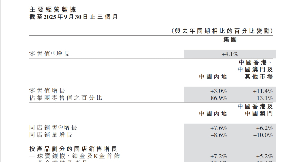 六福集团最新发布的二季报显示(7月1日至9月30日)整体零售收入同比下跌25%,其中中国香港及澳门市场同比下跌31%,中国内地市场则下跌9%。