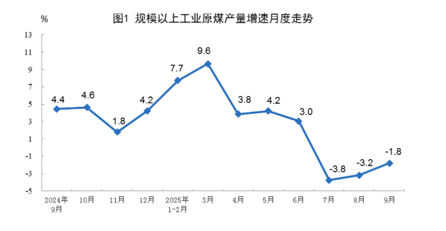 国家统计局:9月份,规上工业原煤产量4.1亿吨,同比下降1.8%