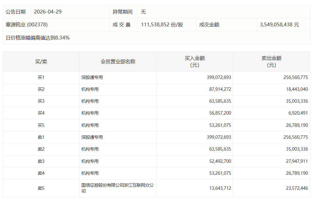 章源钨业今日涨停,5家机构专用席位净买入1.99亿元