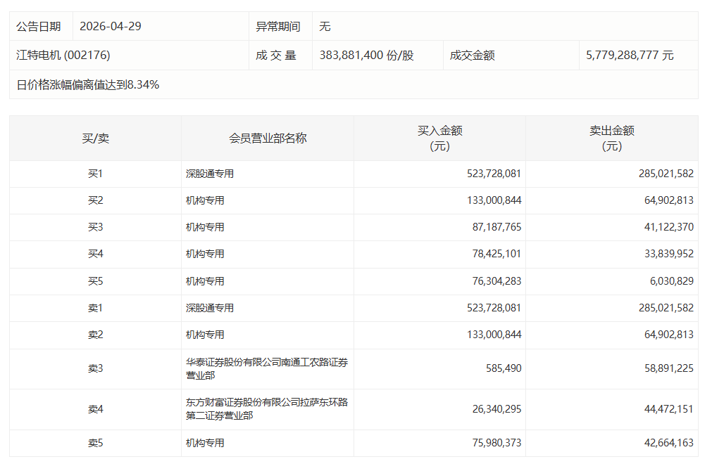 江特电机今日涨停,5家机构专用席位净买入2.62亿元