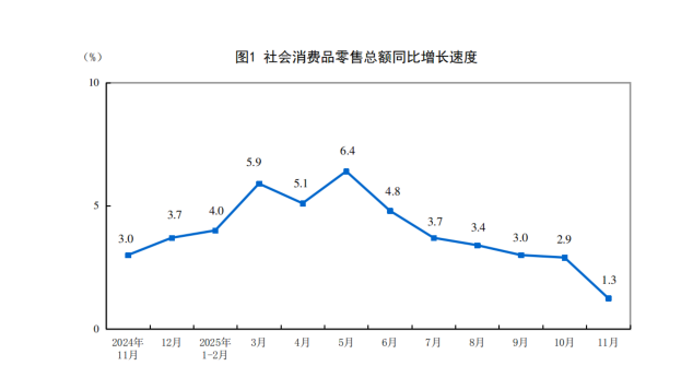 国家统计局:11月份社会消费品零售总额43898亿元,同比增长1.3%