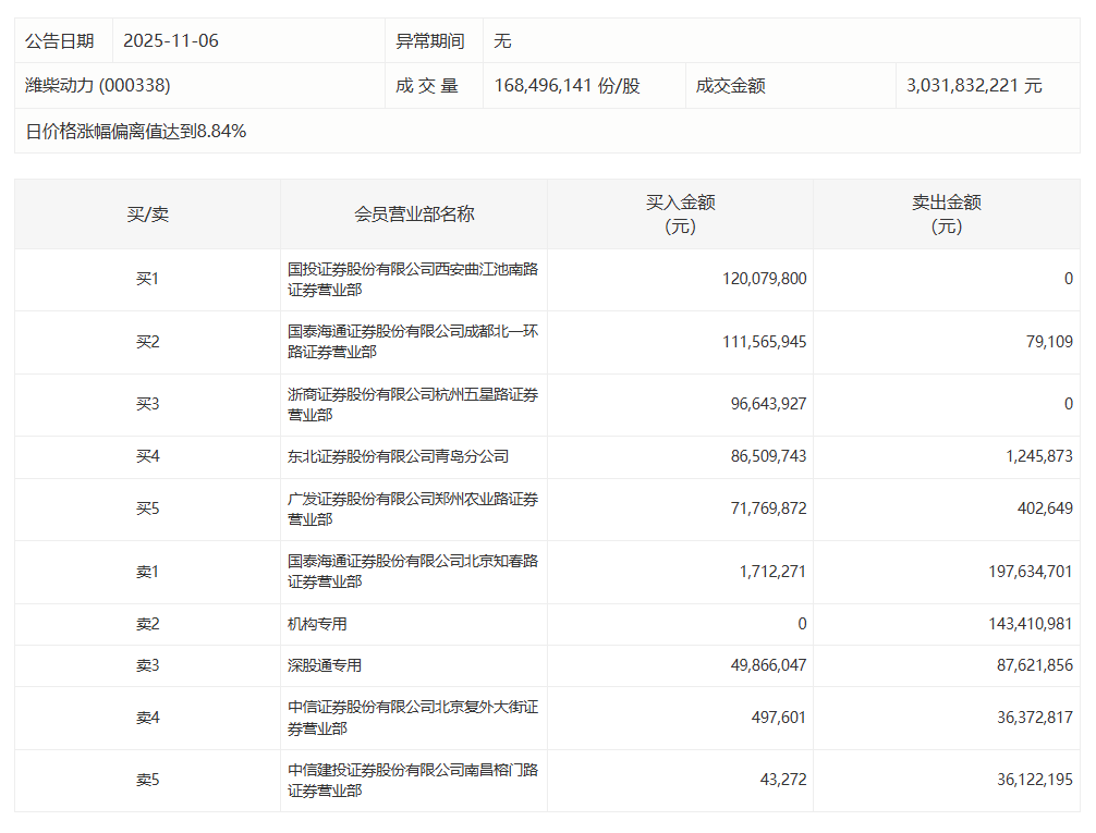 潍柴动力今日涨停,有1家机构专用席位净卖出1.43亿元