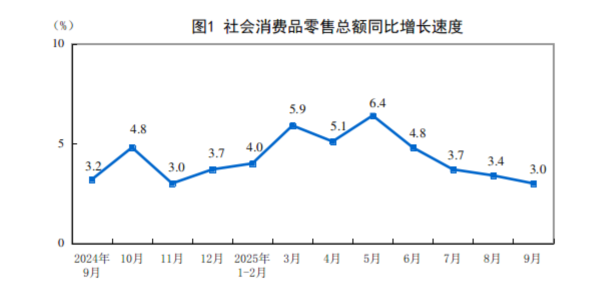 国家统计局:9月份,社会消费品零售总额41971亿元,同比增长3.0%