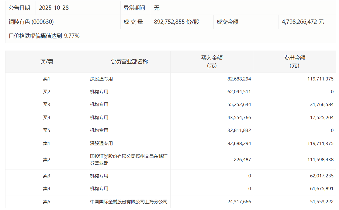 铜陵有色今日跌停,4家机构专用席位净买入1.44亿元