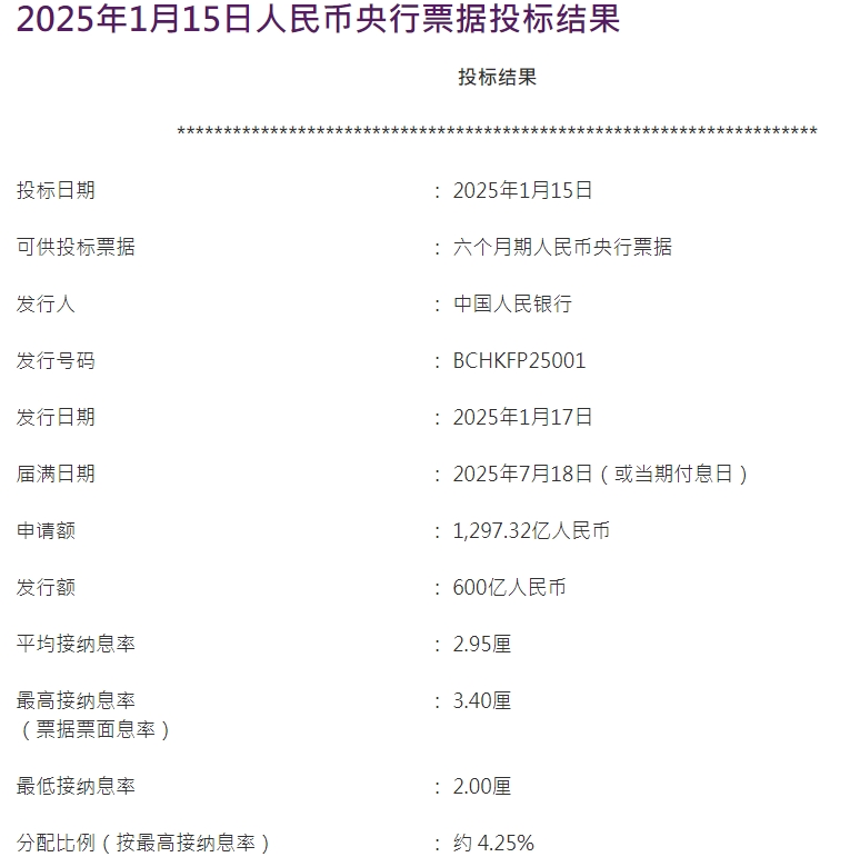 据香港金管局,中国人民银行今日在香港发行600亿元六个月期人民币央行票据,平均中标利率2.95%,最高中标利率3.4%。