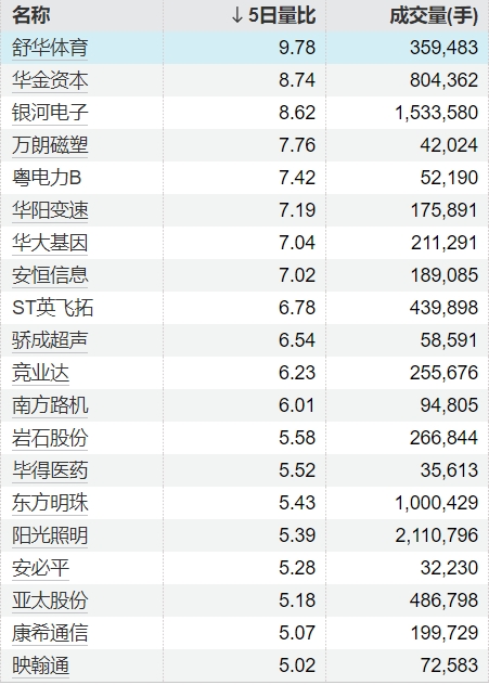 截至2月6日收盘,共20只个股5日量比超过5倍。舒华体育5日量比达9.78倍,华金资本、银河电子5日量比超8倍,万朗磁塑、粤电力B、华阳变速、华大基因、安恒信息5日量比超7倍。