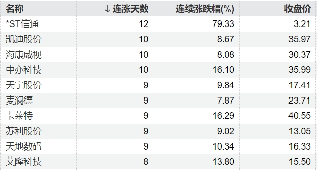 Wind数据显示,截至2月6日收盘,263只个股连续上涨5个交易日及以上。*ST信通连续上涨12个交易日,凯迪股份、海康威视、中亦科技连续上涨10个交易日。从累计涨幅来看,每日互动连涨期间累计涨幅为106.67 %,*ST信通连涨期间累计涨幅为79.33%。