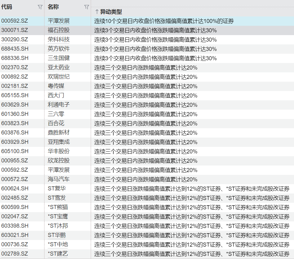 截至3月13日,近日A股有17只个股连续异动2个交易日及以上。信隆健康连续10个交易日内收盘价格涨幅偏离值累计达100%。铜牛信息、康平科技、新柴股份等连续3个交易日内收盘价格涨跌幅偏离值累计达30%塞力医疗、奇精机械、狮头股份等连续三个交易日内涨跌幅偏离值累计达20%。ST高鸿连续三个交易日涨跌幅偏离值累计达到12%。