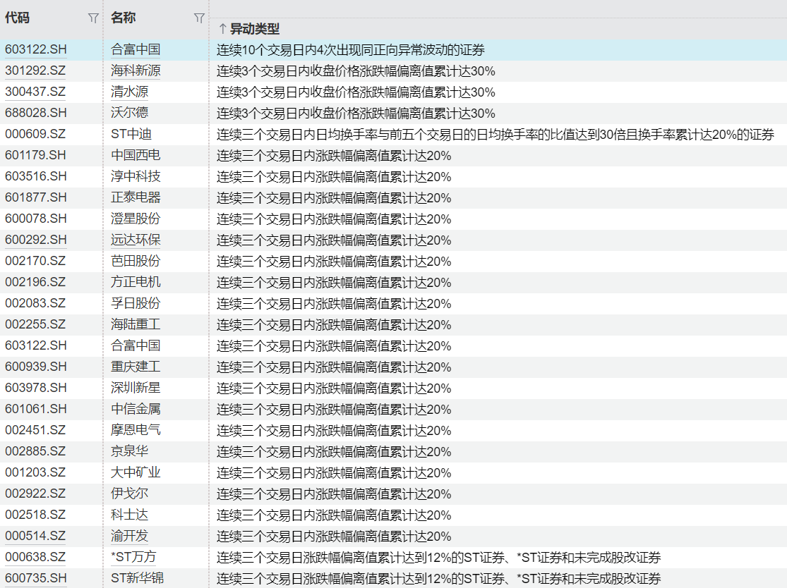 截至4月24日,近日A股有20只个股连续异动2个交易日及以上。新瀚新材、肇民科技连续3个交易日内收盘价格涨跌幅偏离值累计达30%。丰华股份、中毅达、健尔康等连续三个交易日内涨跌幅偏离值累计达20%。*ST海越、*ST九有、*ST人乐等连续三个交易日涨跌幅偏离值累计达到12%。ST张家界连续三个交易日内日均换手率与前五个交易日的日均换手率的比值达到30倍且换手率累计达20%。