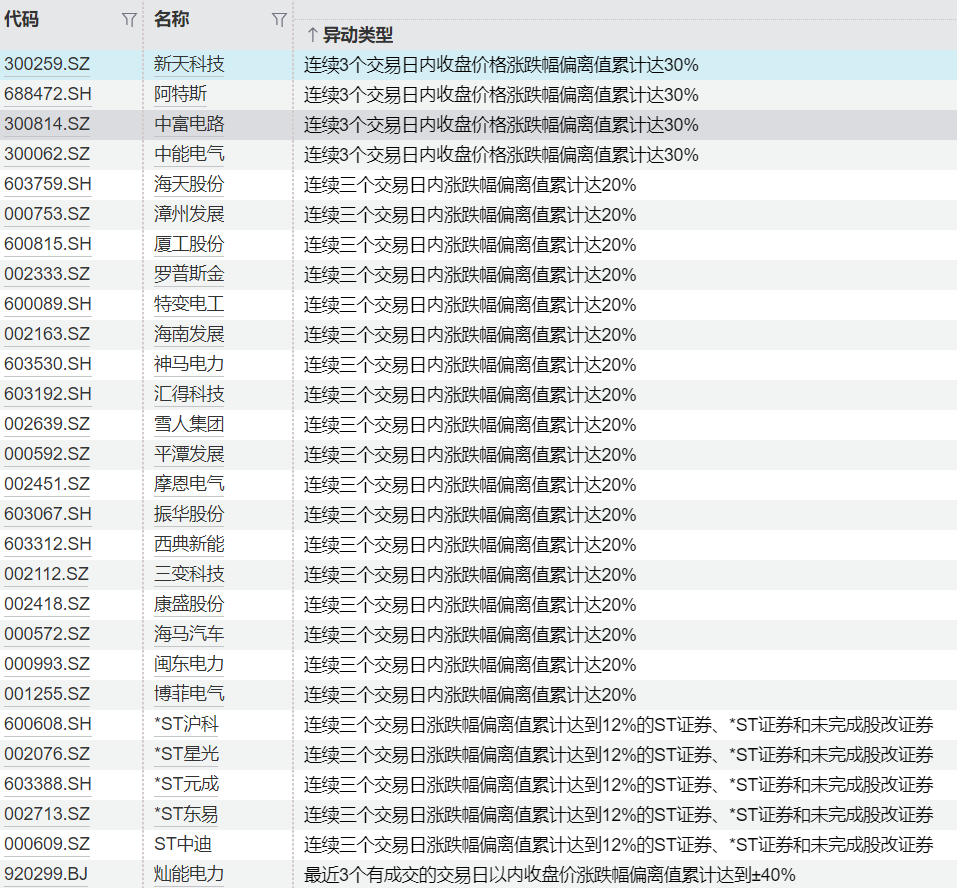 截至4月29日,近日A股有28只个股连续异动2个交易日及以上。*ST中程连续10个交易日内收盘价格跌幅偏离值累计达-50%。雷迪克、新锦动力、博创科技等连续3个交易日内收盘价格涨跌幅偏离值累计达30%。尤夫股份、超讯通信、宝馨科技等连续三个交易日内涨跌幅偏离值累计达20%。ST宏达、*ST九有、*ST人乐连续三个交易日涨跌幅偏离值累计达到12%。云创数据最近3个有成交的交易日以内收盘价涨跌幅偏离值累计达到±40%。