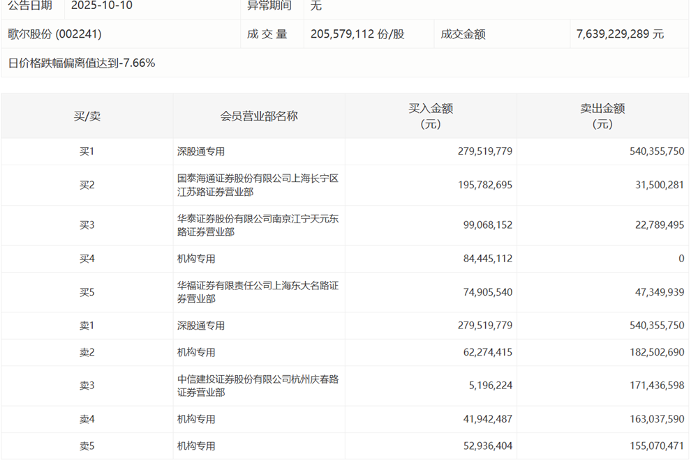 歌尔股份跌超9%,3家机构专用席位净卖出3.43亿元