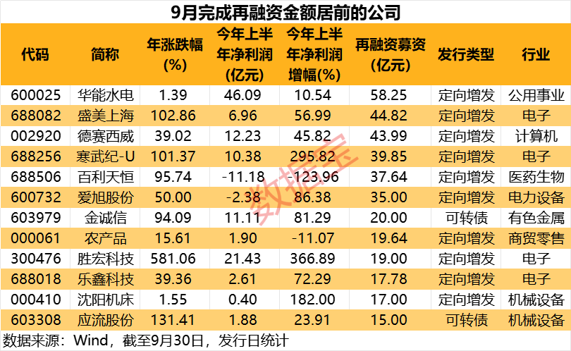 9月份A股再融资完成规模环比增近30% 6家公司募资超35亿元