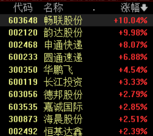 韵达股份涨停,畅联股份此前封板,申通快递、华鹏飞、圆通速递等跟涨。