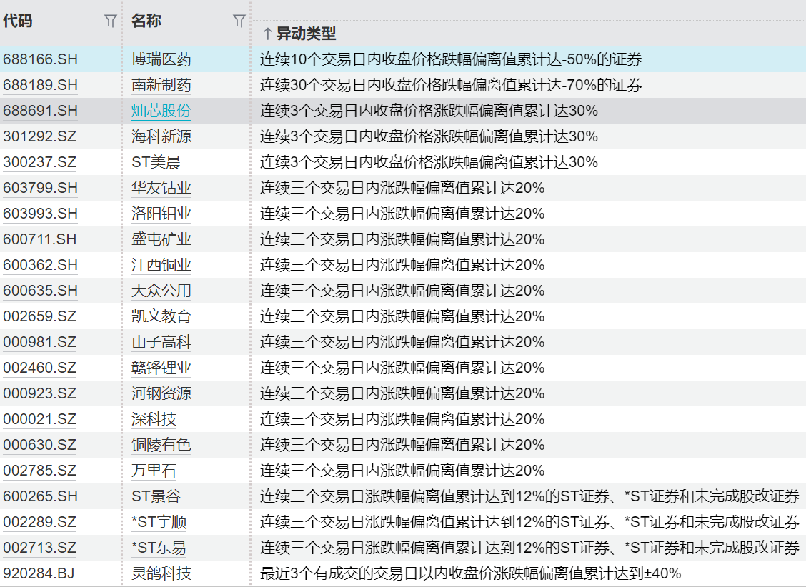 园林股份、科森科技、华光环能等连续三个交易日内涨跌幅偏离值累计达20%。