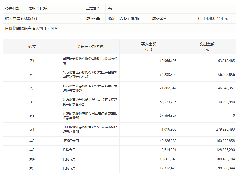 航天发展今日跌10.00% 陈小群席位净卖出2.78亿元