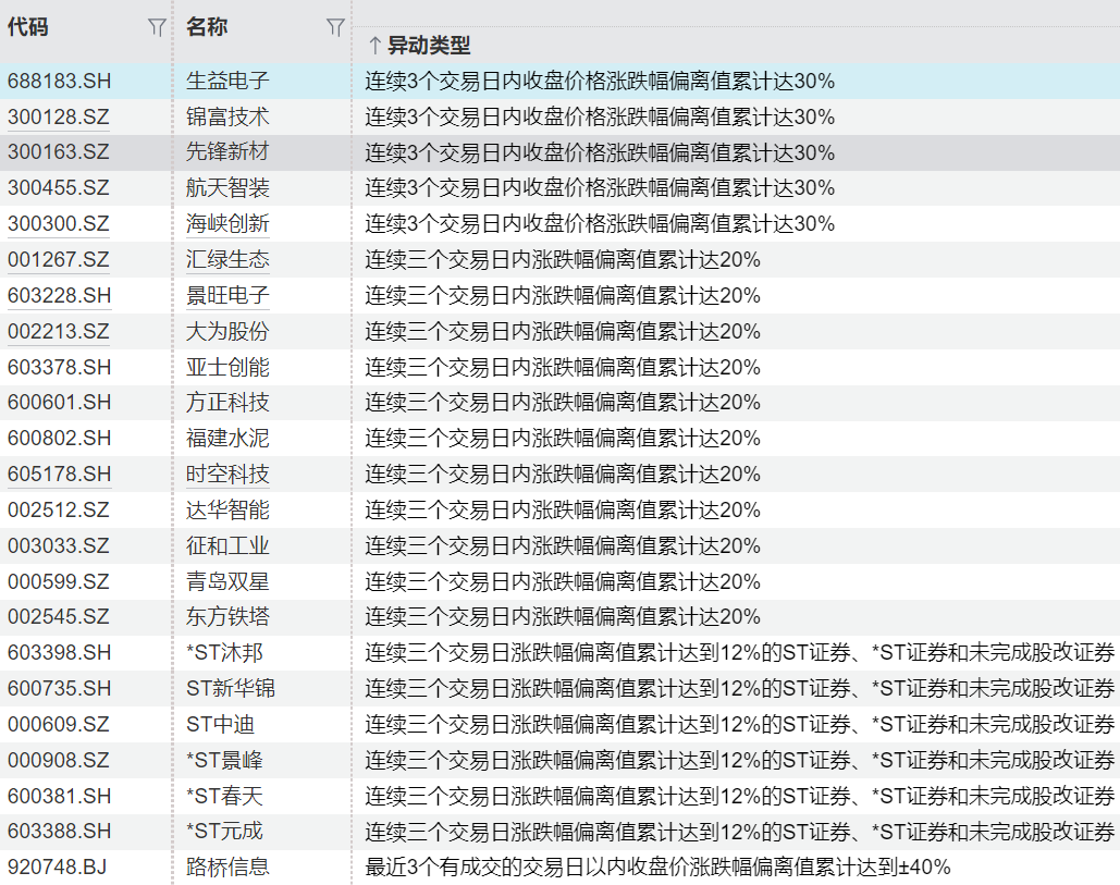 截至9月4日,近日A股有17只个股连续异动2个交易日及以上。上能电气、海博思创、北方长龙等连续3个交易日内收盘价格涨跌幅偏离值累计达30%。欧亚集团、首开股份、建业股份等连续三个交易日内涨跌幅偏离值累计达20%。*ST正平、ST景峰、*ST三圣等连续三个交易日涨跌幅偏离值累计达到12%。鸿智科技、宏裕包材最近3个有成交的交易日以内收盘价涨跌幅偏离值累计达到±40%。