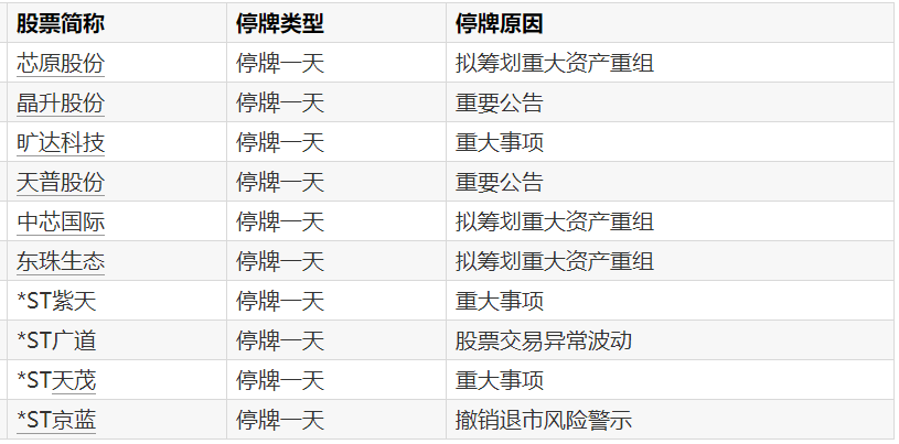 A股停牌提示:9股今日停牌
