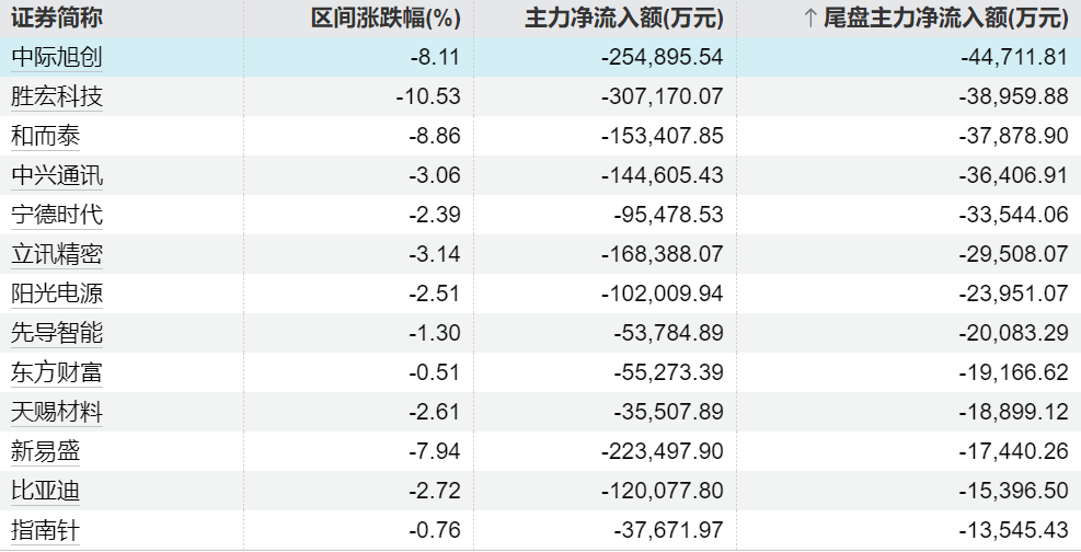 9月9日,主力尾盘大幅净流入胜宏科技、石基信息、幸福蓝海,金额为2.08亿元、9601万元、8691万元;同时,宁德时代、岩山科技、指南针尾盘主力净流出规模居前。