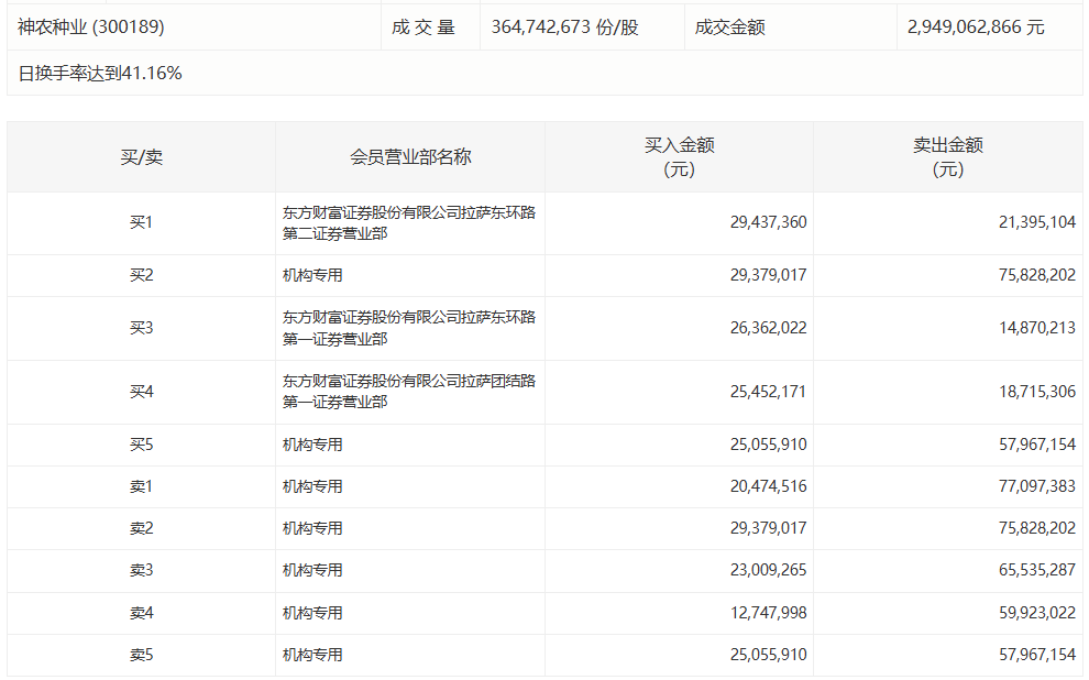 神农种业今日跌1.6%,有5家机构专用席位净卖出2.26亿元